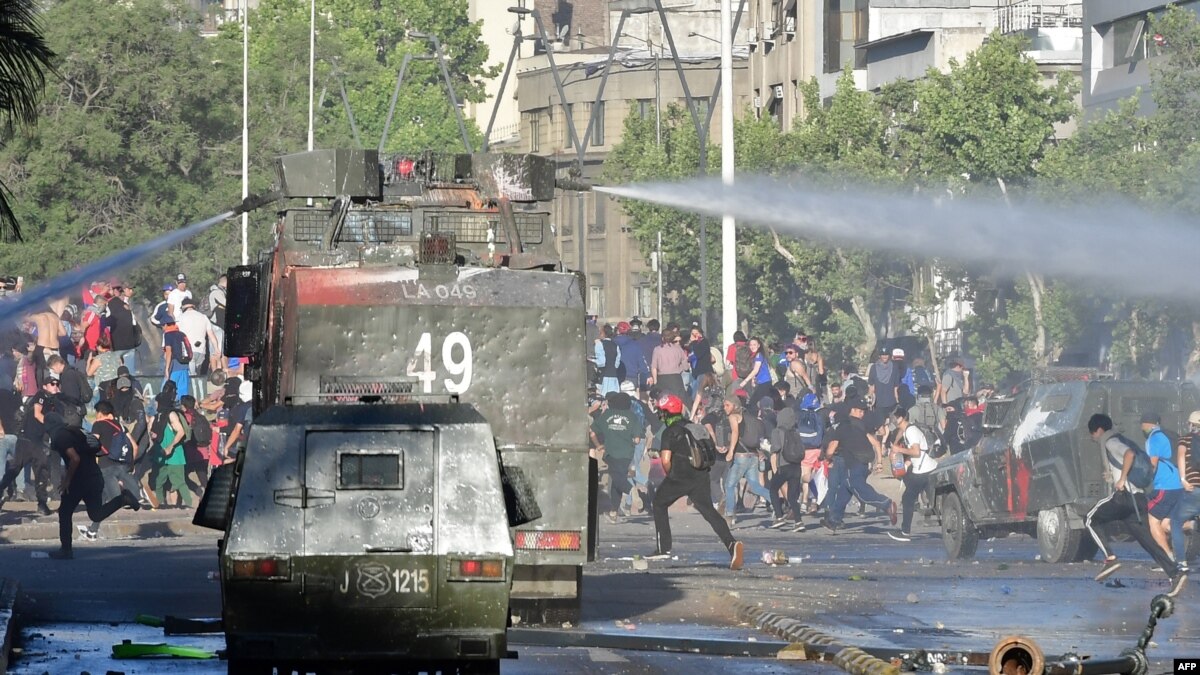 La policía antimotines usó chorros de agua y gas lacrimógeno para dispersar a los manifestantes que se concentraron en varios puntos alrededor del centro comercial, un ícono del progreso económico de Santiago.