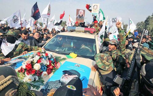 Helicópteros militares sobrevolaron el convoy, integrado por miles de personas que ondeaban banderas de Irak. A su llegada a la plaza de Al Huriya, los ataúdes fueron llevados en hombros durante dos kilómetros hasta la Universidad de Bagdad, en medio de un ambiente solemne roto solo por los rezos y las consignas contra Estados Unidos, Israel y Arabia Saudita. La mayor parte de los asistentes eran integrantes de las milicias chiitas, que el 31 de diciembre y el 1 de enero atacaron la Embajada de Estados Unidos en Bagdad.