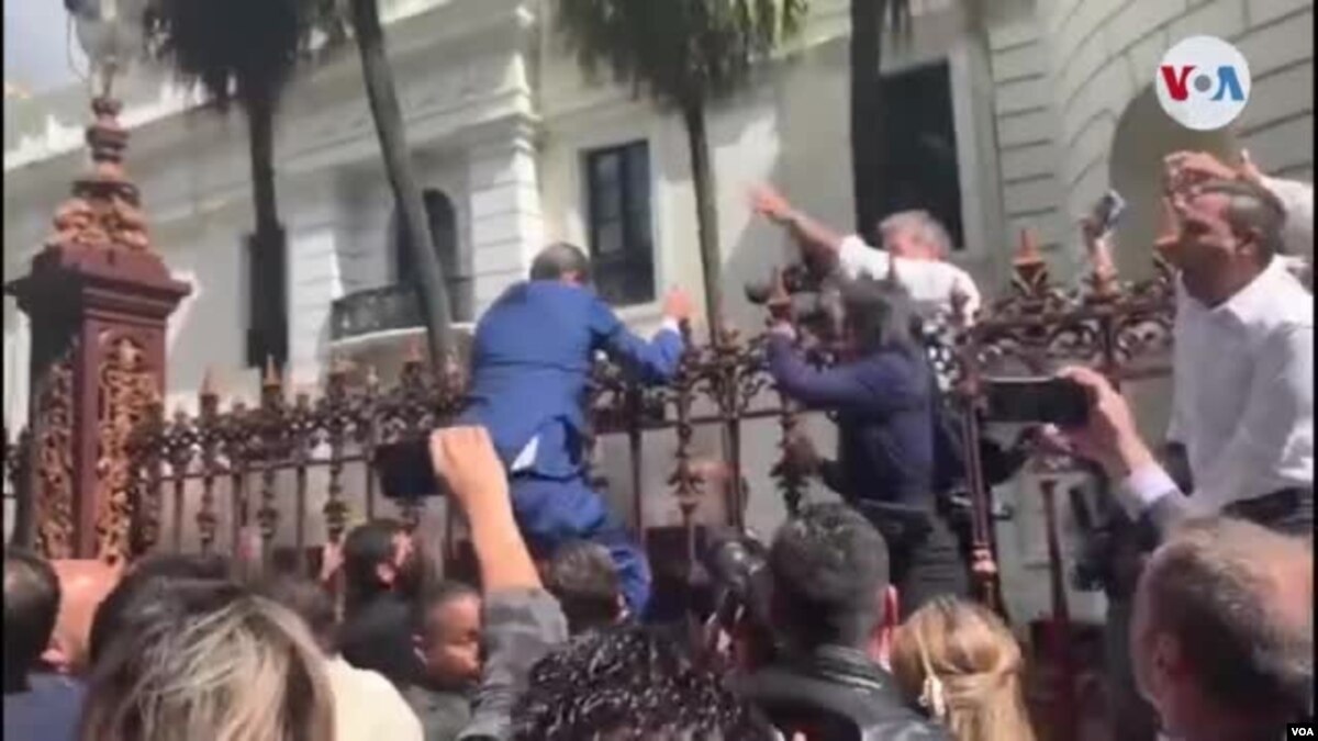 La supuesta elección de Parra se produjo el día en que Guaidó debía lograr la reelección al cargo legislativo. Pero los militares venezolanos bloquearon el acceso de Guaidó y todos los diputados opositores al Palacio Federalk Legislativo. Una foto de Guaidó intentando escalar la verja que rodea al palacio y siendo halado de la chaqueta por varios militares le dio la vuelta al mundo.