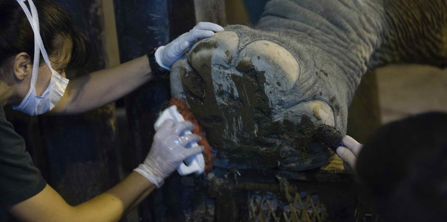 Durante el entrenamiento en un habitáculo rodeado de gruesos barrotes, la elefanta también presenta gentilmente las patas delanteras, las traseras y una oreja, que va asomando a través de ventanas situadas a distinta altura, a medida que sus cuidadores se lo solicitan. En esas áreas del cuerpo se le podrían realizar extracciones de sangre durante la cuarentena.